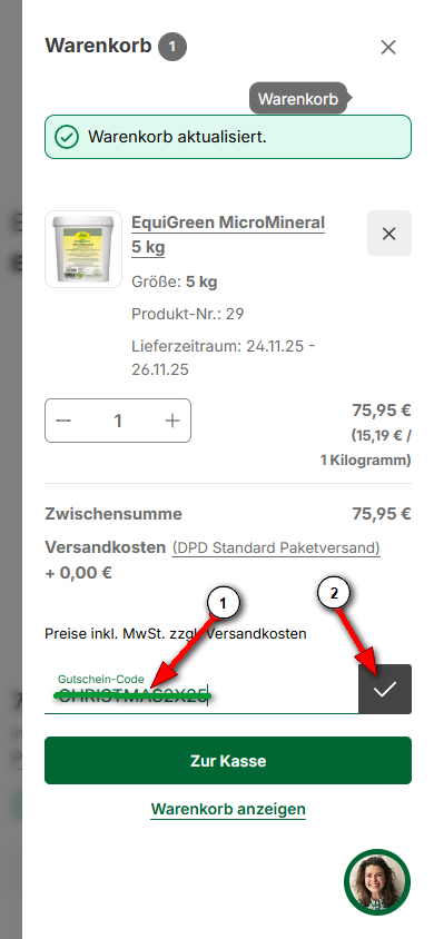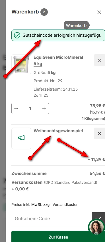 Wenn du einen gültigen Gutschein hast, gib ihn bereits im Warenkorb im vorgesehenen Feld ein.