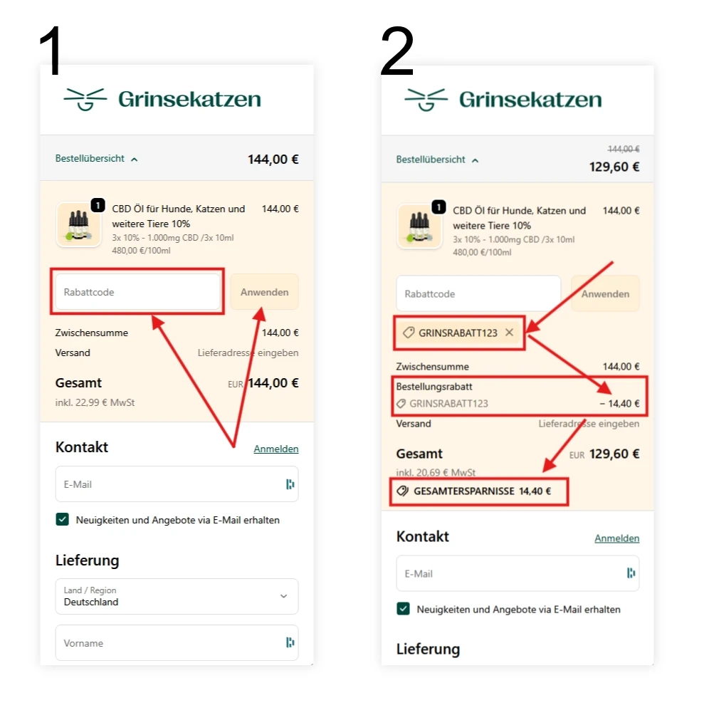 - Der Rabatt Code wird einfach im Bestellprozess eingelöst